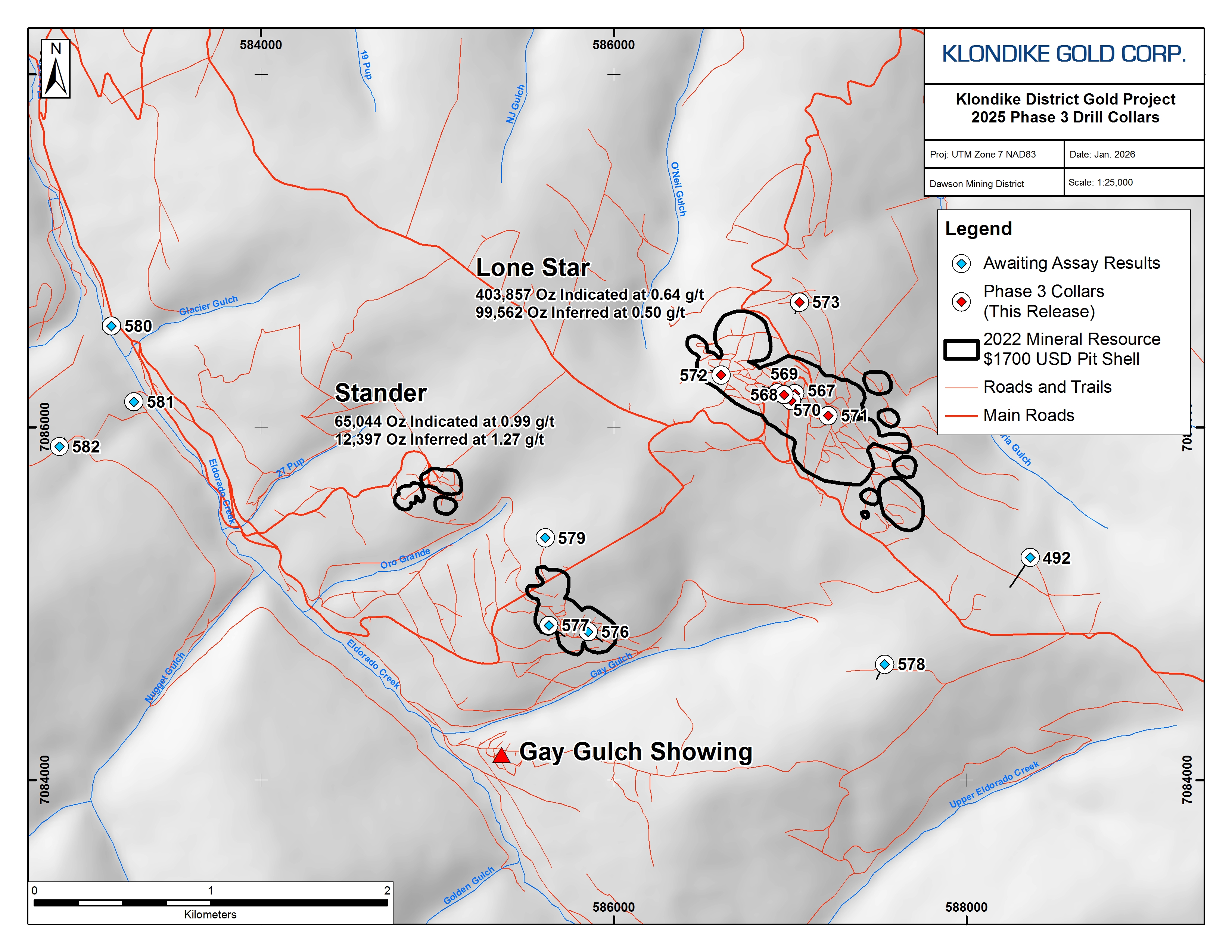 Peter Tallman, President and CEO of Klondike Gold Corp commented “We are extremely pleased with these substantive new Lone Star drill hole results. Drilling along the edges and outside the Lone Star MRE confirmed our structural/stratigraphic understanding of the continuity of mineralization and will allow us to target step-out drilling further along strike and to depth with confidence. 2025 preparatory efforts of Phase 1 structural drilling and Phase 2 comprehensive relogging and new geology work has begun to pay off in these Phase 3 results, and we expect this to continue. This work brings the Company closer to understanding a district-wide standard model of gold mineralization.
